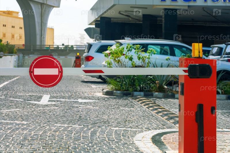 Закрытый шлагбаум запрещает въезд на парковку частного жилого комплекса, гостиницы, частной собственности