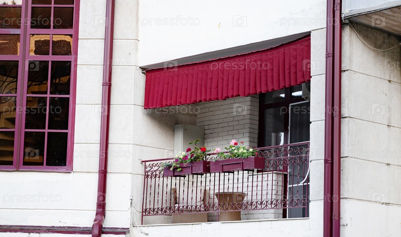 Уютный балкон с красным навесом и цветочными горшками на фасаде здания