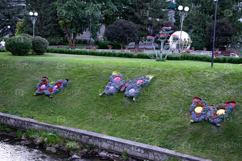 Красочные цветочные композиции в виде бабочек на травянистом склоне холма в парке