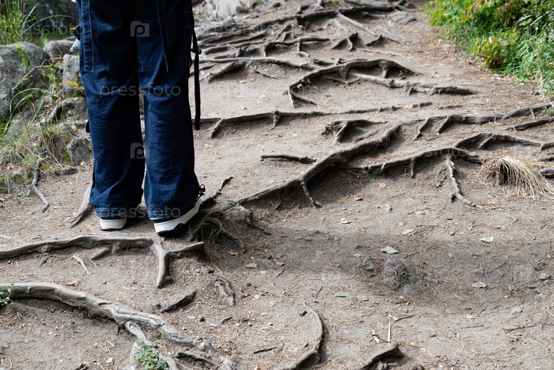 Человек, стоящий на грунтовой тропе с обнаженными корнями деревьев в лесу