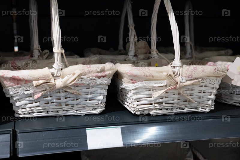 Пустая плетеная корзина на кухонном столе, на фоне мраморной стены. корзина для хлеба и фруктов
