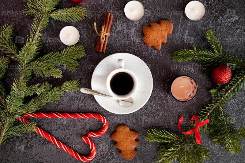 Рождественский коричневый фон с елкой и украшениями на темной деревянной доске. Рождественские обои. Рождественская, новогодняя композиция с местом для текста. Плоская планировка, вид сверху