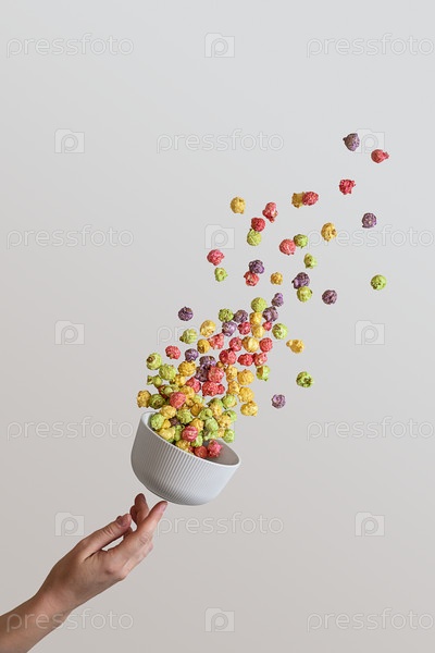 Женская рука толкает белую керамическую миску, из которой на светлом фоне летит попкорн. Попкорн падает из белой керамической миски