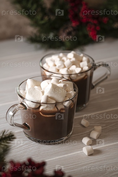 Крупный план горячих шоколадных напитков с белым мини-зефиром. Рождественский фон с горячим шоколадом с зефиром в стеклянной кружке