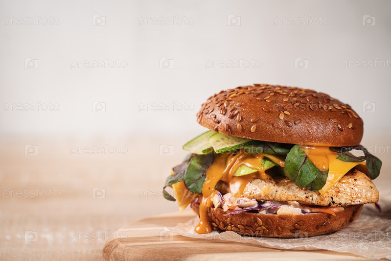 Крупный план домашнего бургера с куриной грудкой и овощами. Бургер с кунжутной булочкой, жареная куриная грудка, один плавленый ломтик сыра, авокадо, салат, огурцы, капустный салат