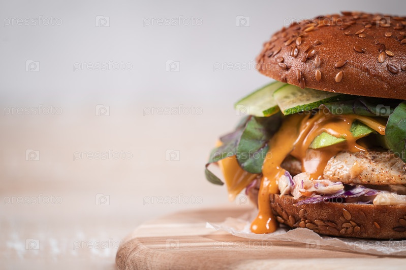 Крупный план половины домашнего бургера с куриной грудкой, овощами. Бургер с кунжутной булочкой, жареная куриная грудка, один плавленый ломтик сыра, авокадо, салат, огурцы, капустный салат