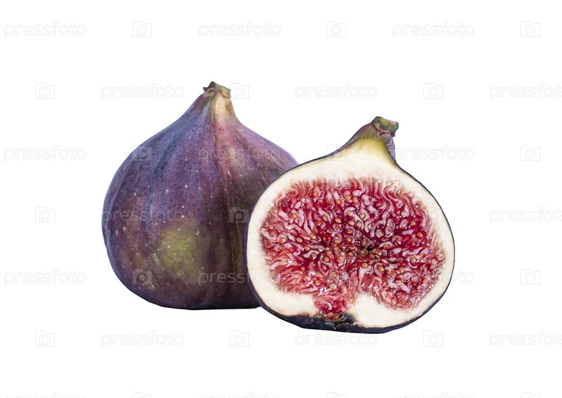 Разрезанный пополам и целый инжир, изолированный на белом. Свежий инжир, изолированный на белом
