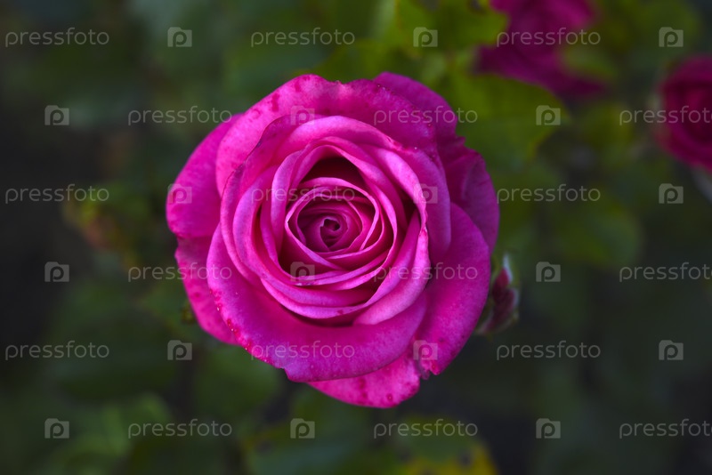 Ярко-розовый цветок розы на зеленом кусте. Сочные розы в летнем саду