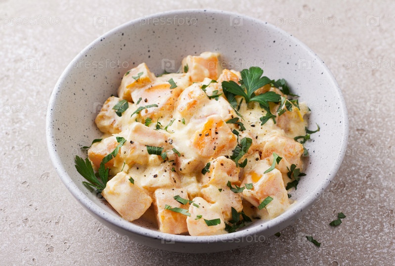 Чаша тыквы в сметанном соусе, посыпанная свежей петрушкой на бежевом фактурном каменном столе. Вегетарианская еда