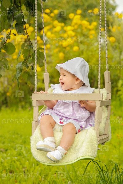 Радостный и счастливый малыш отлично проводит время, катаясь на качелях в ярком и красочном саду