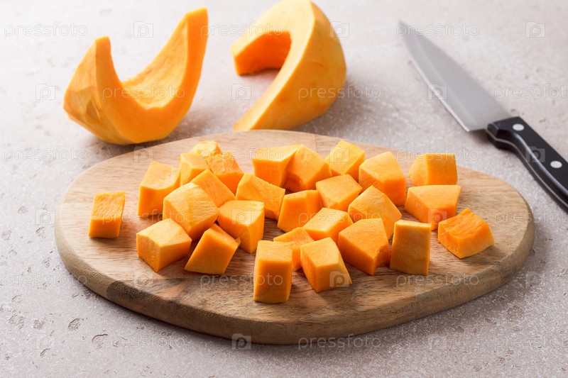 Тыква, разрезанная на кусочки на деревянной доске на бежевом фактурном фоне
