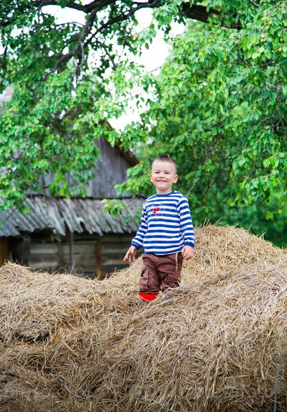 Ребенок, радостно играющий на стоге сена в деревенской обстановке фермы