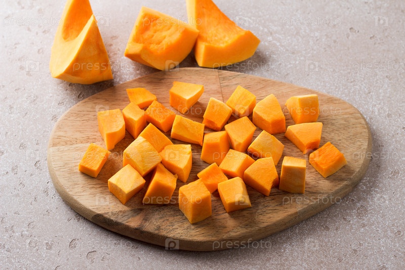 Тыква, разрезанная на кусочки на деревянной доске на бежевом фактурном фоне