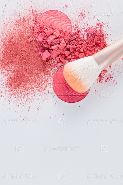 Блок, восполняющий румяна на рассыпчатых сухих румянах розового тона с помощью кисти для макияжа. белый фон. Верхний вертикальный вид. Копировальное пространство. концепция красоты