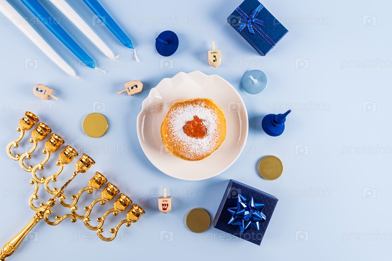 Жареный пончик с сахарной пудрой и джемом на тарелке, свечи, минор, дрейдлы, золотые монеты на синем фоне. Концепция Хануки