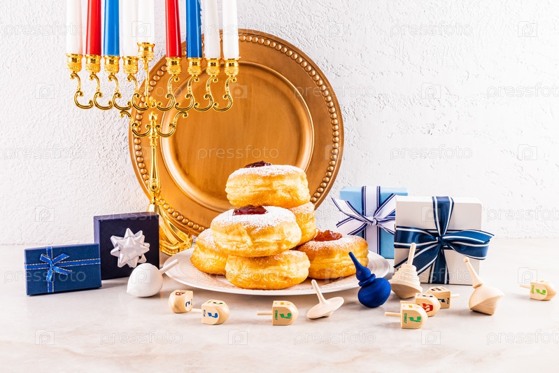 Жареный пончик с сахарной пудрой и джемом на тарелке, менора, дрейдлы, коробки с подарками. Текстурированный фон стены. Концепция Хануки