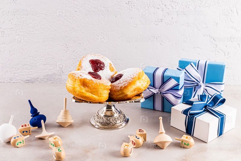 Праздничные пончики на серебряном блюде среди коробок с подарками к празднику Ханука. деревянные четырехгранные дрейделы. Концепция Хануки