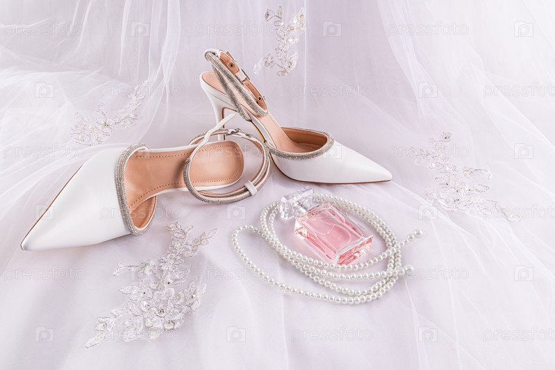 Шикарные туфли невесты стоят на вышитом свадебном платье со стразами. Флакон розовых духов, окруженный жемчужными бусинами. свадебный натюрморт