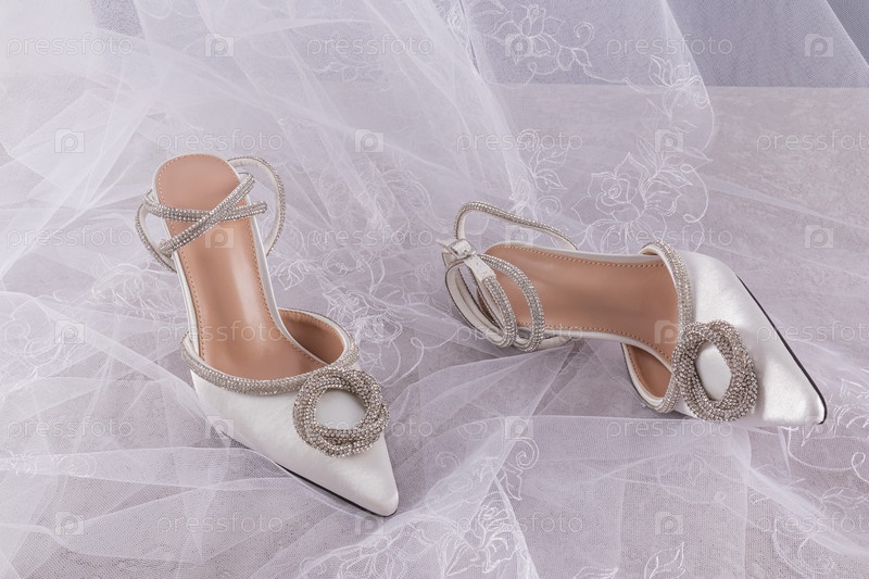 Пара элегантных белых атласных свадебных туфель с отделкой из страз на белой свадебной классической фате. Презентация свадебных туфель