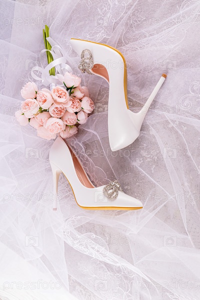 Шикарные белые туфли невесты с бантом из стразов лежат на прозрачной фате невесты с нежным розовым букетом пионов. Вид сверху. Копировать пространство