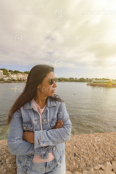Латиноамериканка в джинсовой куртке и солнцезащитных очках смотрит на воду под облачным небом, Порто Петро, Майорка, Балеарские острова, Испания