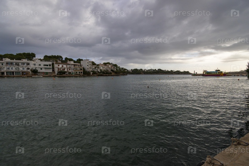 Прибрежный город под серым, облачным небом с темной водой и пасмурной атмосферой, порто петро, майорка, балеарские острова, испания