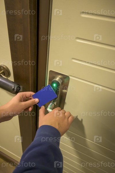 Крупный план руки, использующей синюю карточку-ключ на замке двери отеля, электронный замок с ключом, номер отеля, отпуск на Майорке, Испания