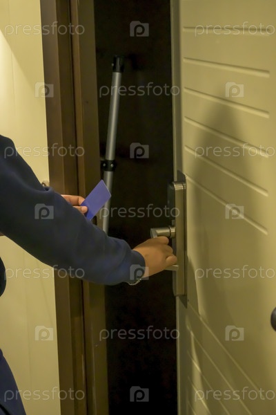 Латиноамериканский молодой человек открывает дверь с помощью ключа-карты в коридоре, электронный замок, номер отеля, отпуск на Майорке, Испания