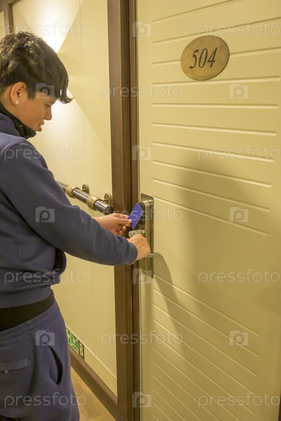 Латиноамериканский молодой человек открывает дверь с помощью ключа-карты в коридоре, электронный замок, номер отеля, отпуск на Майорке, Испания
