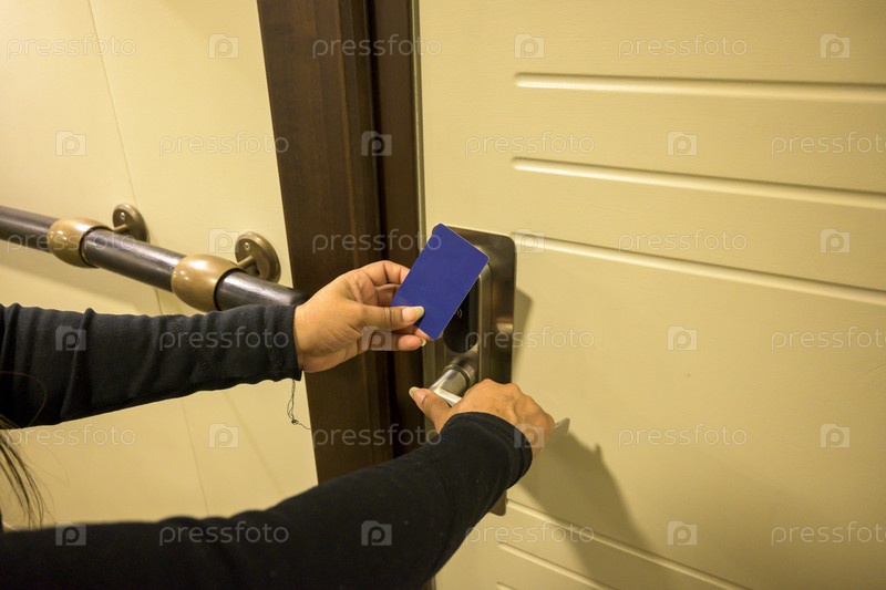Латиноамериканка открывает дверь карточкой-ключом в коридоре, электронный замок, номер в отеле, отдых на Майорке, Испания
