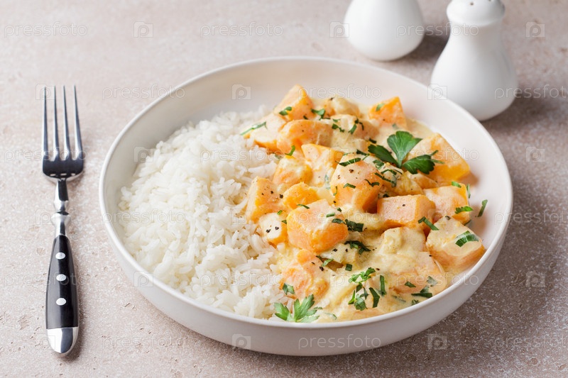 Чаша тыквы в сметанном соусе с рисом, посыпанная свежей петрушкой на бежевом фактурном каменном столе, вид сверху. Вегетарианская еда