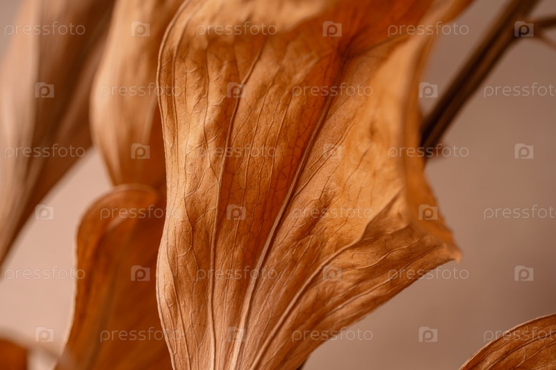 Сушеный лист крупным планом, макро-тенденция, осенний коричневый лист с естественной текстурой как природный фон. Осенний эстетический фон с текстурой листьев с прожилками, осенняя листва, красота природы