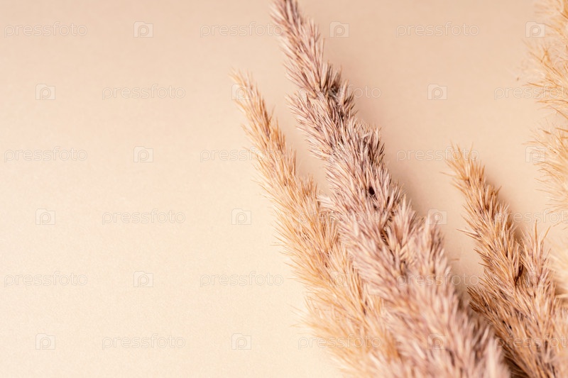 Сухие пампасные камышовые травы на светло-бежевом фоне. Креативный вид сверху с букетом пампасной травы на нейтральном фоне с местом для текста. Экологически натуральная плоская планировка. Пушистая пампасная трава