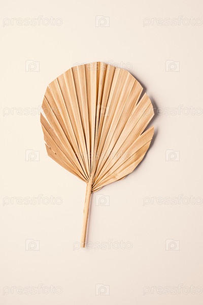 Сухой тропический экзотический пальмовый лист на бежевом фоне. Плоская планировка, вид сверху минималистский цветочный плакат эстетика