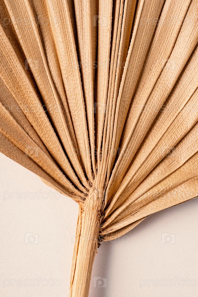 Сухой экзотический пальмовый лист крупным планом на бежевом фоне сверху. Минимальный растительный фон. Плакат, тонированное изображение