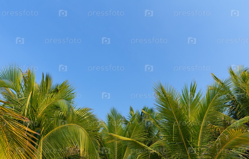 Вид снизу вверх на пальмы с зелеными листьями, создающими тропическую атмосферу. Голубое небо видно сквозь листву