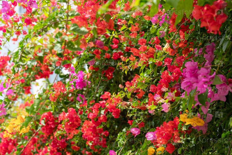 Красочные цветы бугенвиллеи и зеленая листва создают атмосферу тропического сада