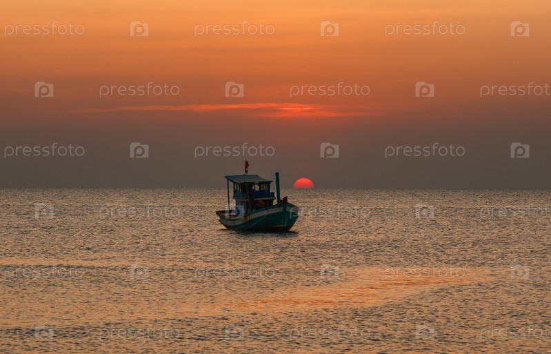 Вид на лодку, плывущую в океане на фоне оранжево-красного заката. Солнечный свет отражается в воде, добавляя драматизма и красоты сцене