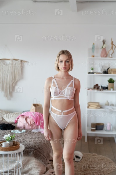 Молодая красивая женщина позирует в белом нижнем белье в студии
