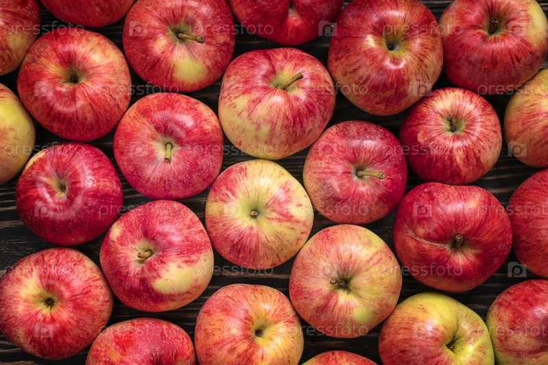 Вид сверху на собранные красные яблоки. Спелые яблоки на деревянном столе