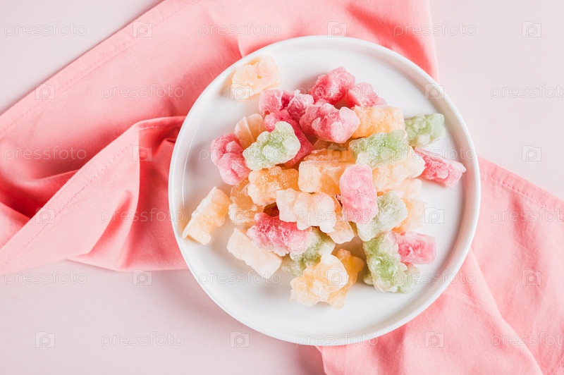Крупный план замороженных желейных мишек на тарелке на столешнице