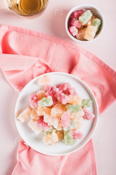 Сублимированные жевательные конфеты на тарелке на столешнице и вертикальный вид