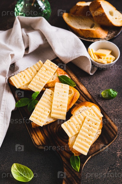 Жареные тосты с сыром и базиликом на доске на столе вертикальный вид