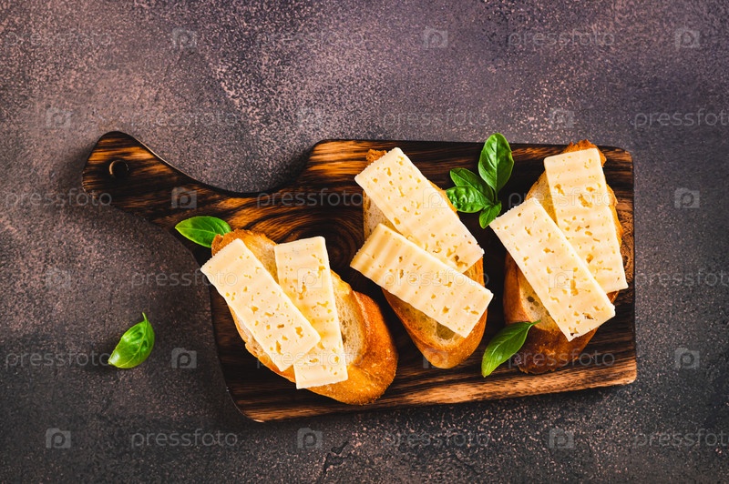 Крупный план сэндвичей с сыром на тостах и листьев базилика на доске на столешнице