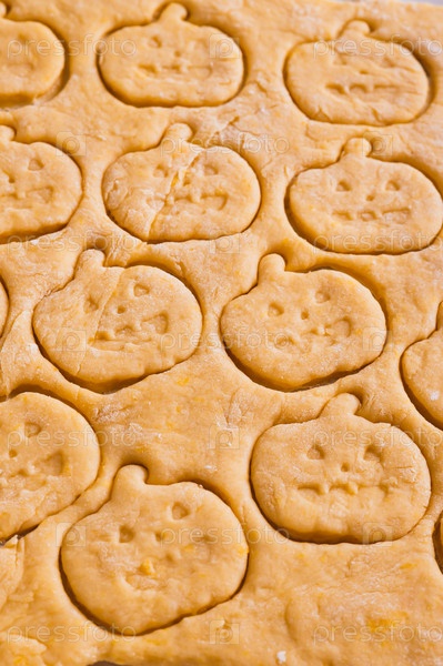 Тыквенное печенье с вырезанным лицом из сырого теста на бумаге для выпечки вертикальный вид