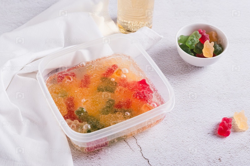 Мармеладные мишки, пропитанные лимонадом, приготовленные для заморозки конфет в контейнере на столе