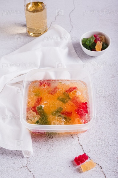 Мармеладные конфеты настаиваются в лимонаде для последующей заморозки в контейнере вертикальный вид
