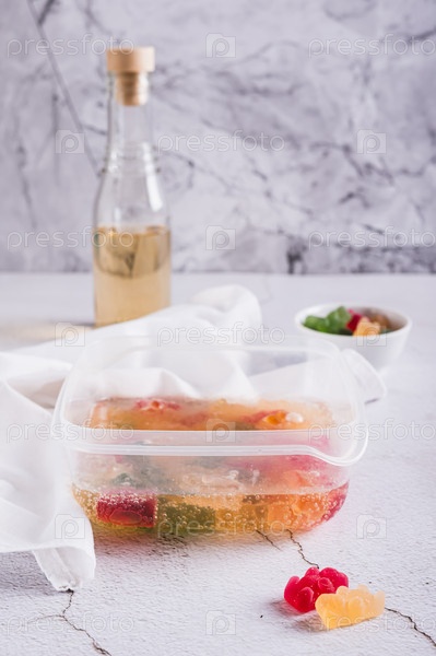 Мармеладные мишки, пропитанные лимонадом, приготовленные для замороженных конфет в контейнере на столе, вертикальный вид