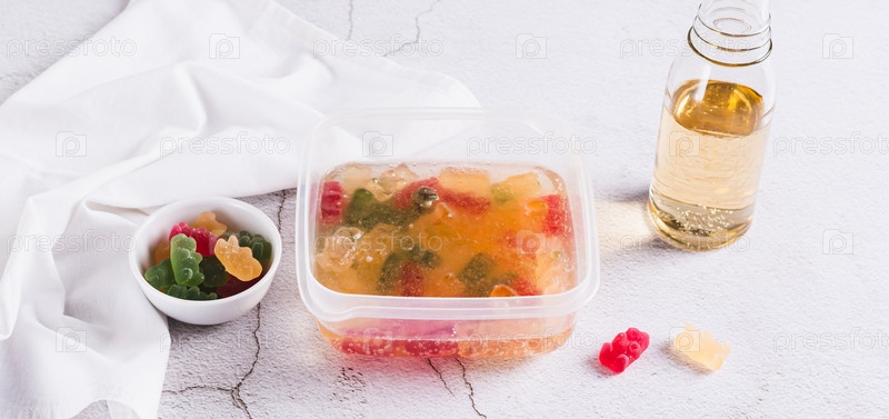 Мармеладные мишки, пропитанные лимонадом, приготовленные для замороженных конфет в контейнере, веб-баннер