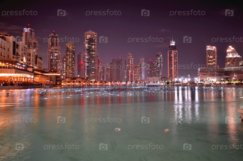 Ночной вид на небоскребы в Дубае, Объединенные Арабские Эмираты